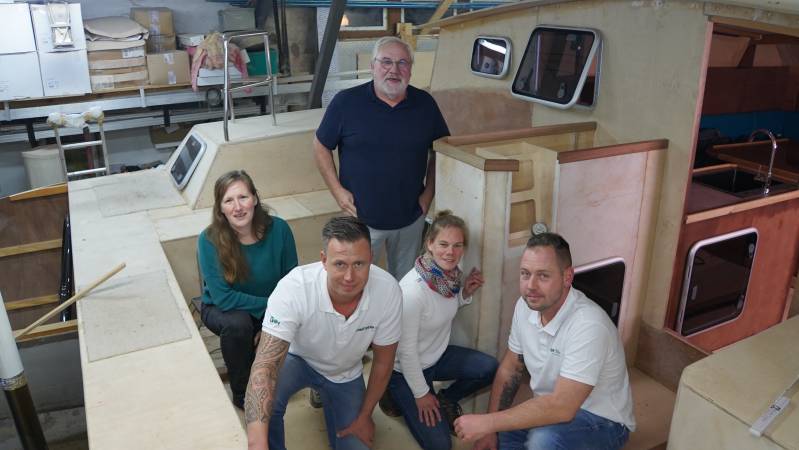 Benjamin und Marcel zu Gast auf der Werft, um Vorschläge zum Einbau der Anlage zu unterbreiten. Hier mit dem FYD-Team (v.l.n.r.) Cindy, Frank und Anna (Morgan hat das Foto gemacht ☻)