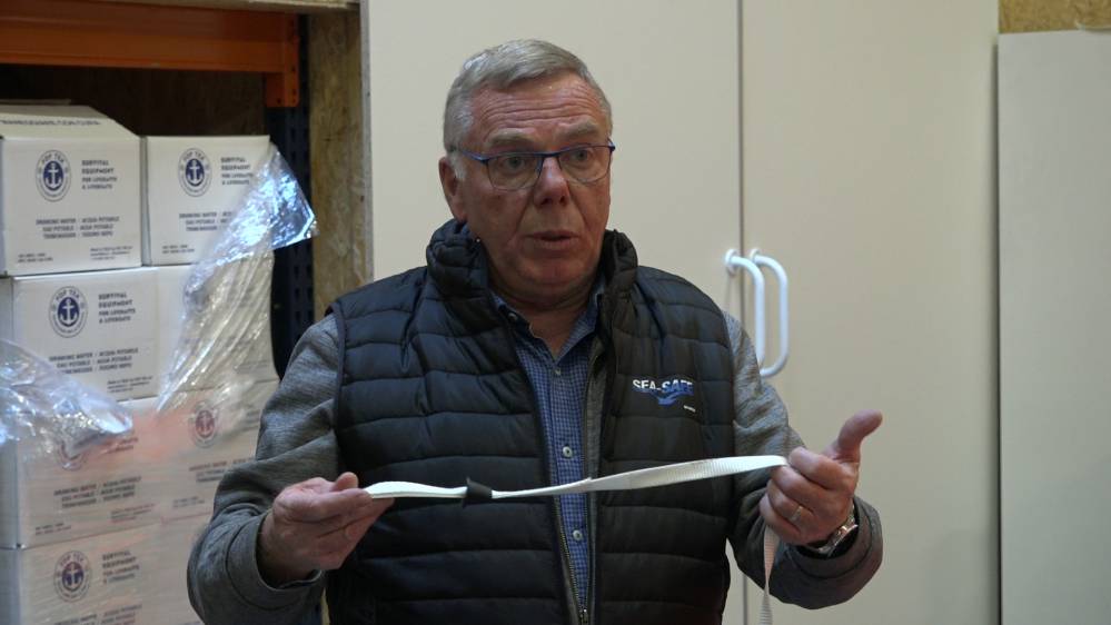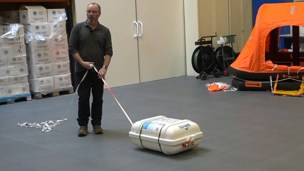 Marc hält hier die Reißleine einer Rettungsinsel in der Hand. Eine Reißleine ist 10 Meter lang und wird am Boot befestigt. Man zieht an der Leine, bis eine rote Markierung erscheint. Mit einem Ruck löst man dann die Rettungsinsel aus.
