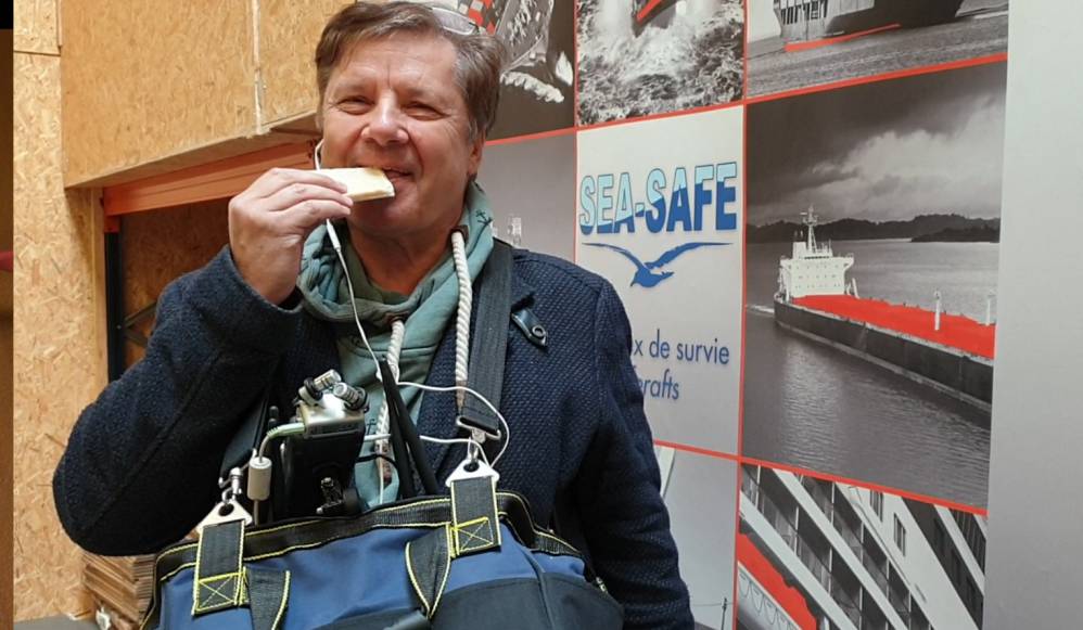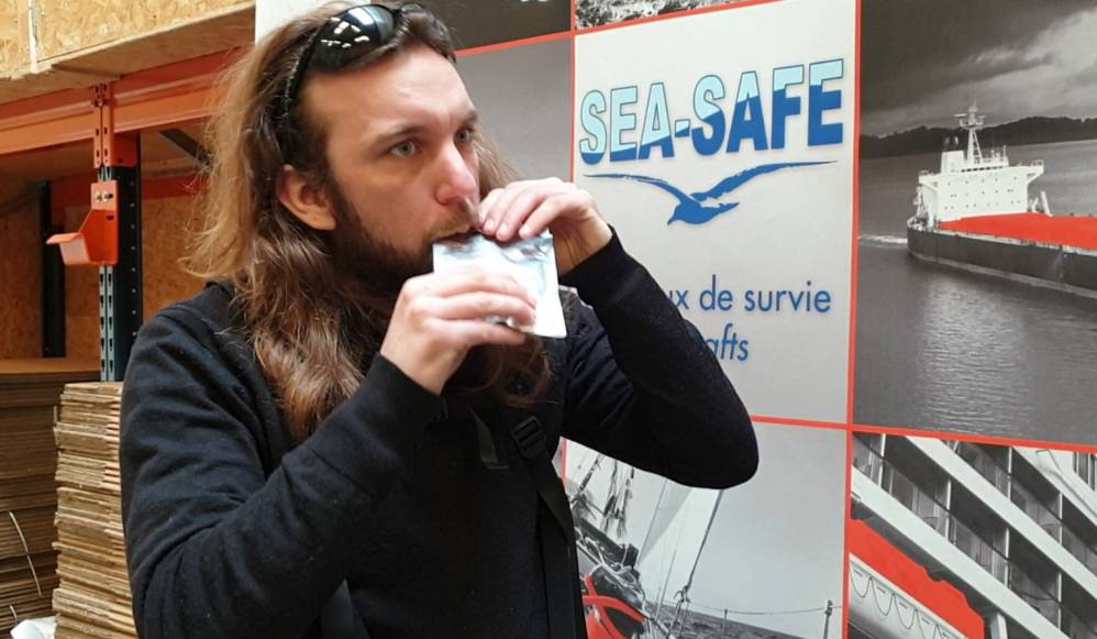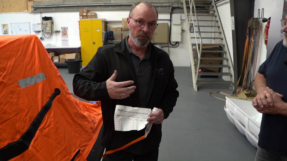 Christophe hält hier den Personalausweis einer Rettungsinsel in der Hand: Eigentümer, Name des Schiffes, Datum der letzten Überprüfung