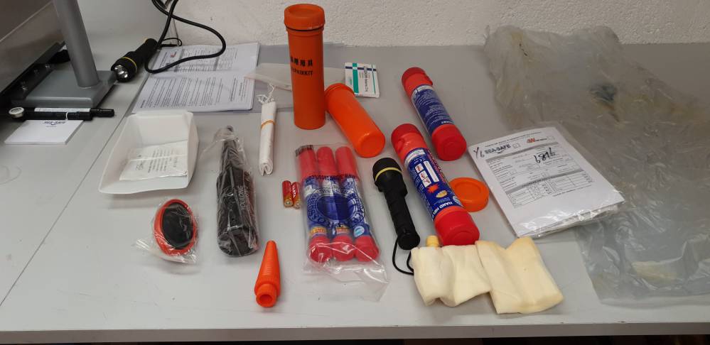 Reparaturset, Medikamente, Fallschirmraketten, Leuchtfackeln, Taschenlampe mit Batterien, Bootsschöpfer, Signalspiegel...
