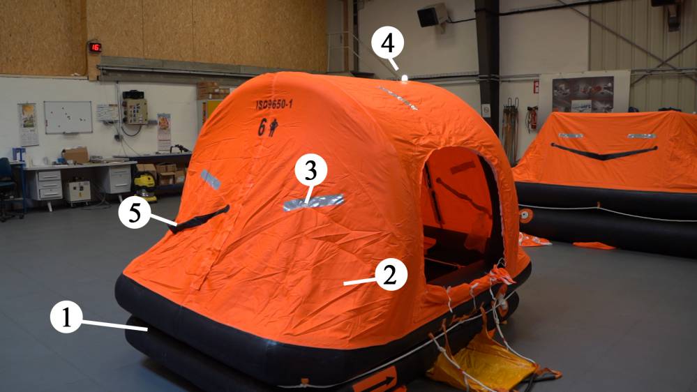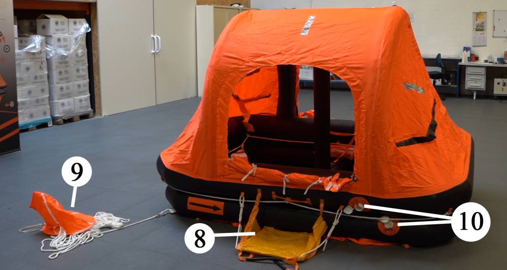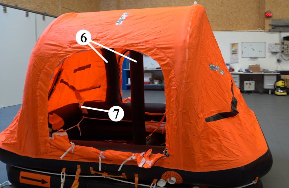 - 6: Zwei aufblasbaren „Überrollbügeln“. Diese mit der Rettungsinsel gleichzeitig aufgeblasenen Gummischläuche richten die Rettungsinsel auf