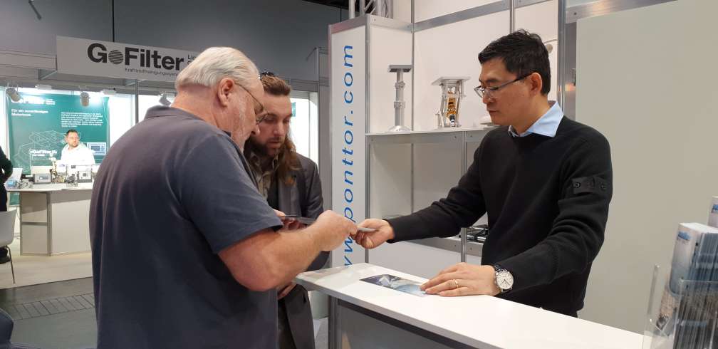 Ye auf der BOOT in Düsseldorf im Beratungsgespräch mit Frank und Morgan, welche Art von Stuhl für unseren Forschungskatamaran am besten geeignet ist.
