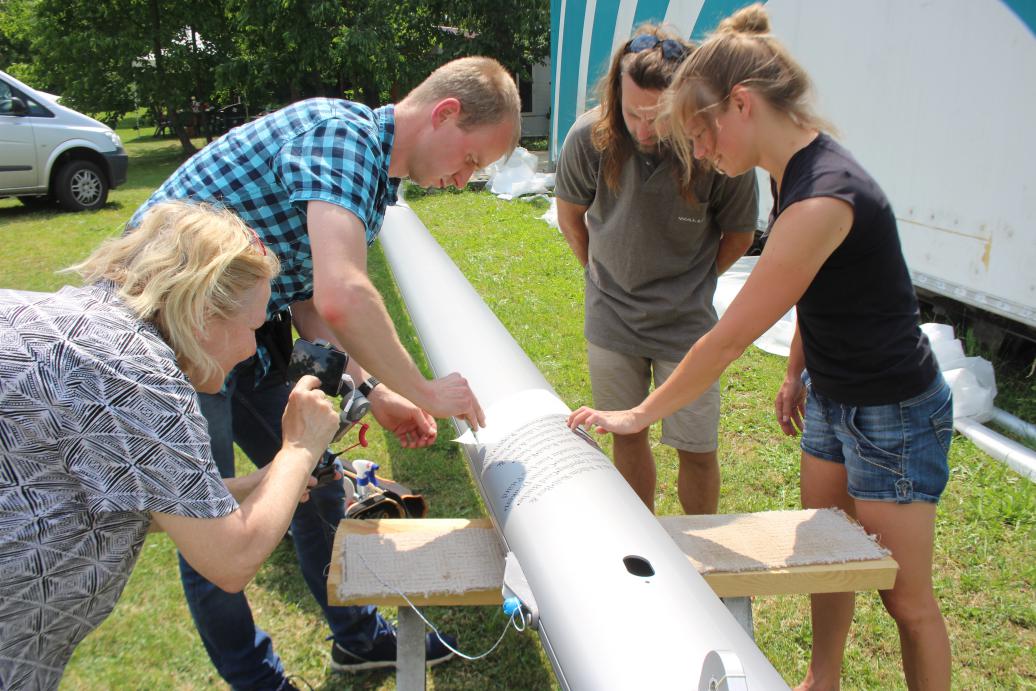 Steffen, der Geschäftsführer der Druckerei in Manschnow, hat die Verantwortung übernommen, die Namen unserer Unterstützer mit einer Spezialfolie für zehn Jahre auf dem Mast zu verewigen.