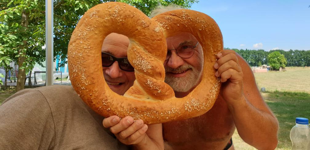 Frank und Maurizio mit der Superbrezel, die Ronny für ihn gebacken hat.