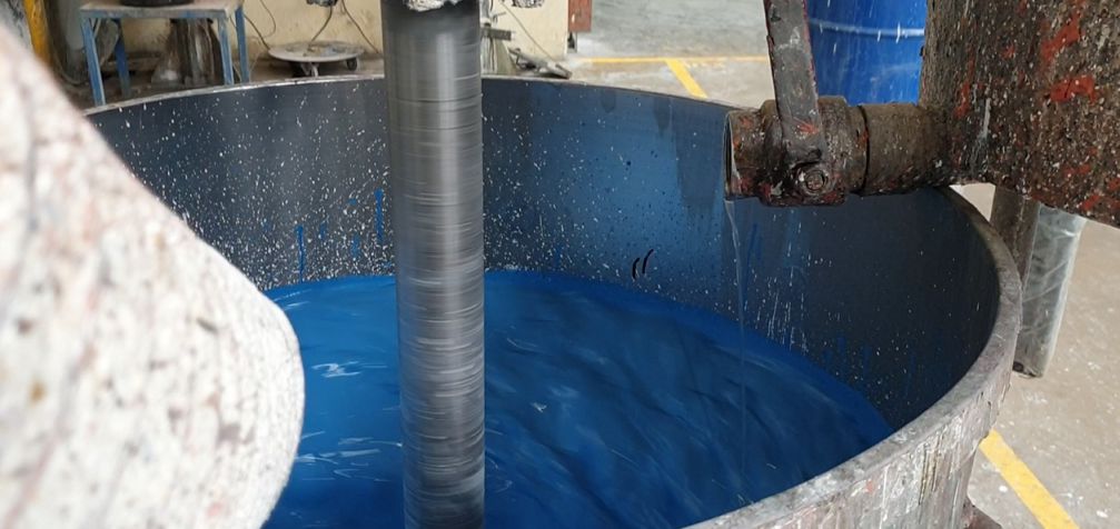 Und all diese Komponenten müssen vermischt werden. Hier ist Damien gerade am Industriemischer und und stellt 300 Kilogramm graue Antikorrosionsfarbe her.