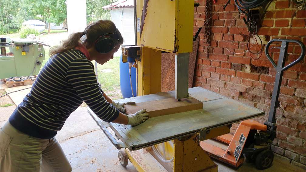 Anna beim Zuschneiden eines Mahagonistückes auf der Bandsäge.