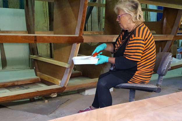 Unsere physiotherapeutische „Minnie Maus“ wird mit ihren Kompetenzen unser Projekt unterstützen und hat darüber hinaus für sich selbst die Freude am Bootsbau entdeckt. Sie geht sehr talentiert mit Werkzeugen und Maschinen um.