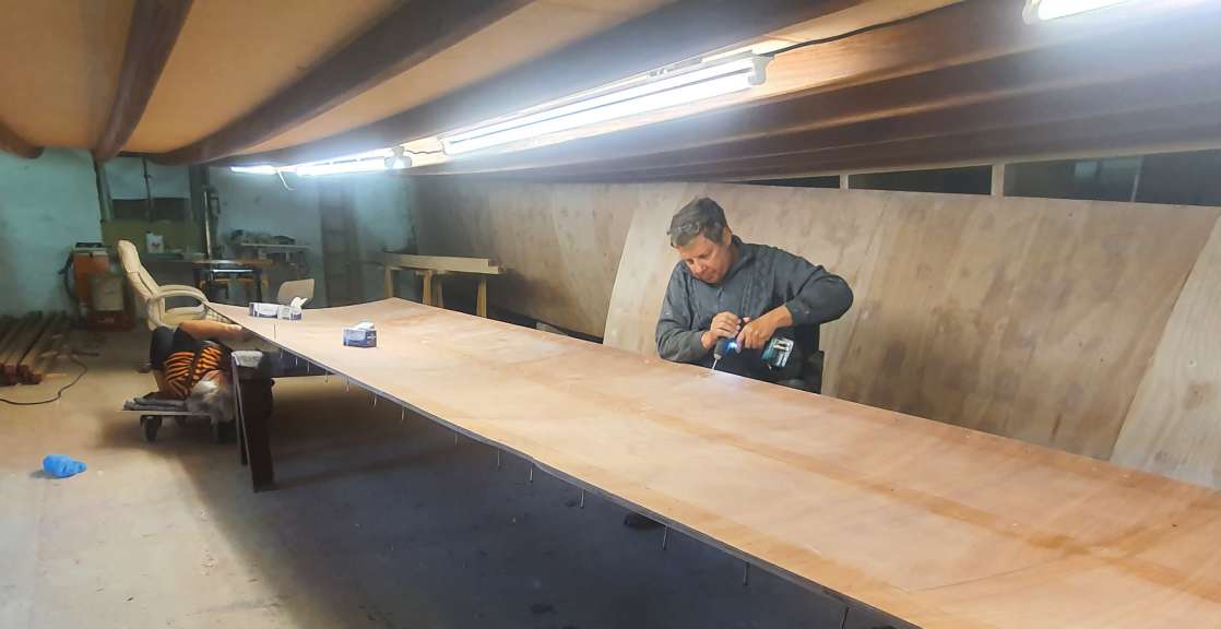 Peter (rechts) bei den Vorbereitungen für die Verklebung der Innenhaut.