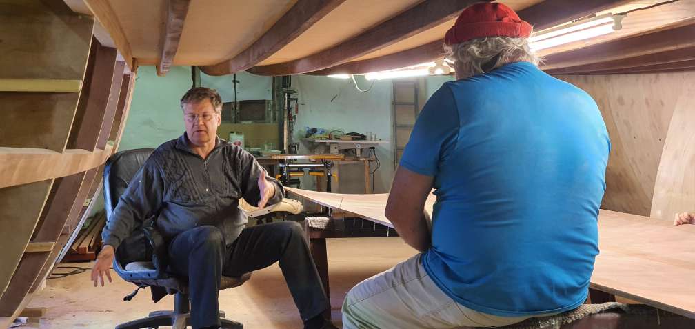 Frank (r., CEO von FYD-Adventure) bespricht mit Maurizio die Kohlefaserversteifung auf der Außenhaut.