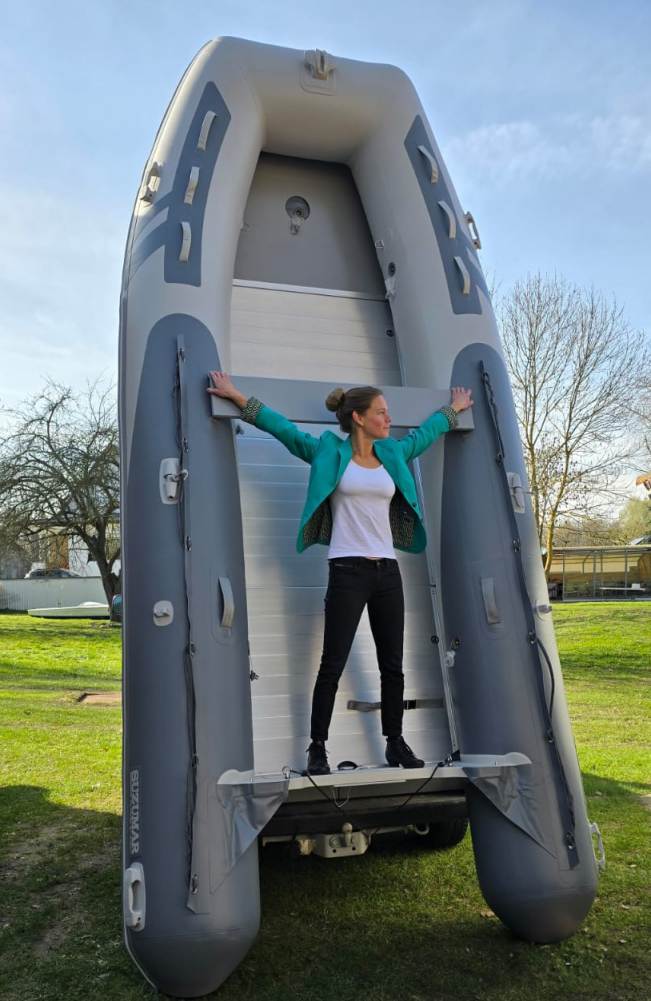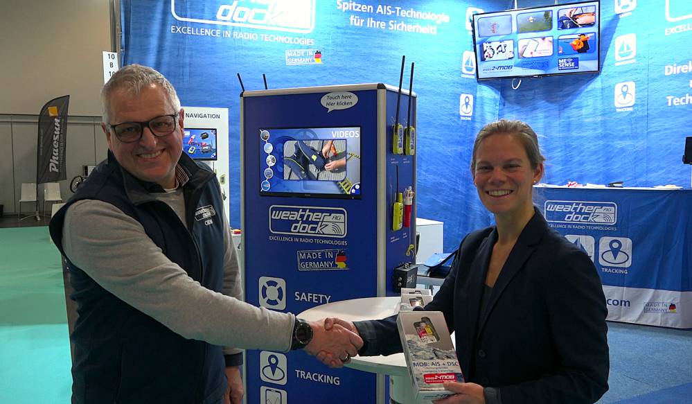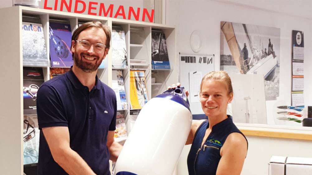 Symbolische Übergabe mit Gewicht: Franz Lindemann (Geschäftsführer der Robert Lindemann KG) überreicht Anna von FYD-Adventure einen 33 kg schweren ROCNA Anker – für sicheres Ankern auf neuen Expeditionen.