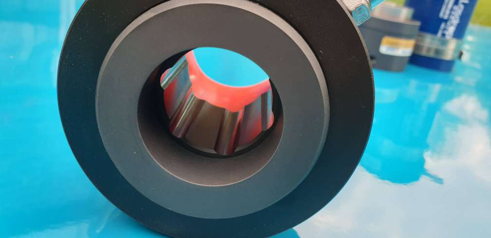 Das Silikonrohr verbindet Stevenrohr und Graphitbuchse – beweglich gelagert, seefest verbunden, dauerhaft dicht.