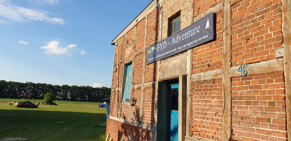 Unsere Bootsbauwerkstatt im Oderbruch – mit dem von Steffen Paulus gestalteten FYD-Adventure-Banner, das weithin sichtbar unsere Vision in die Welt trägt
