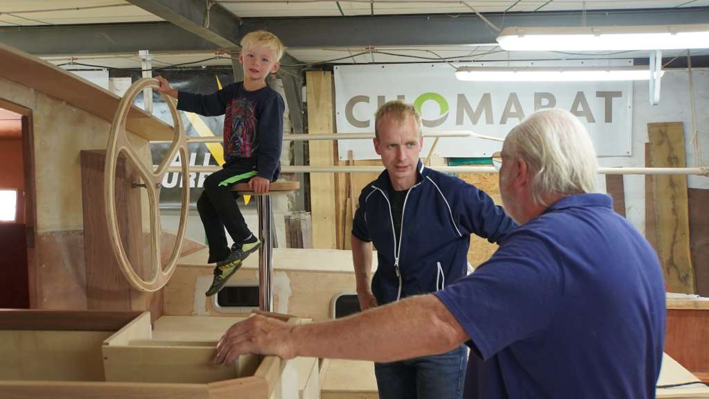 Steffen Paulus, Geschäftsführer der Paulus & Partner GmbH, mit Sohn Bruno in unserer Bootsbauwerkstatt – über fünf Jahre lang ein fester Anker unseres Projekts und sichtbarer Macher hinter zahlreichen hochwertigen Drucksachen