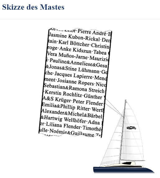Diese Skizze zeigt, wie aus vielen einzelnen Namen eine große Idee wächst. Werde Teil unserer Geschichte und segle mit uns – auf einem Mast, der Gemeinschaft, Mut und Zukunft trägt