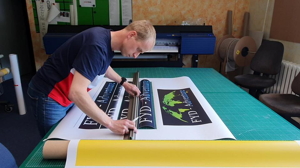 Der Slogan von Steffen Paulus: „Wir machen (mehr als) Werbung!“ Hier schneidet er gerade die Plakate von FYD-Adventure zu.