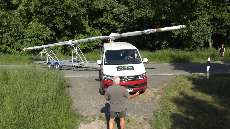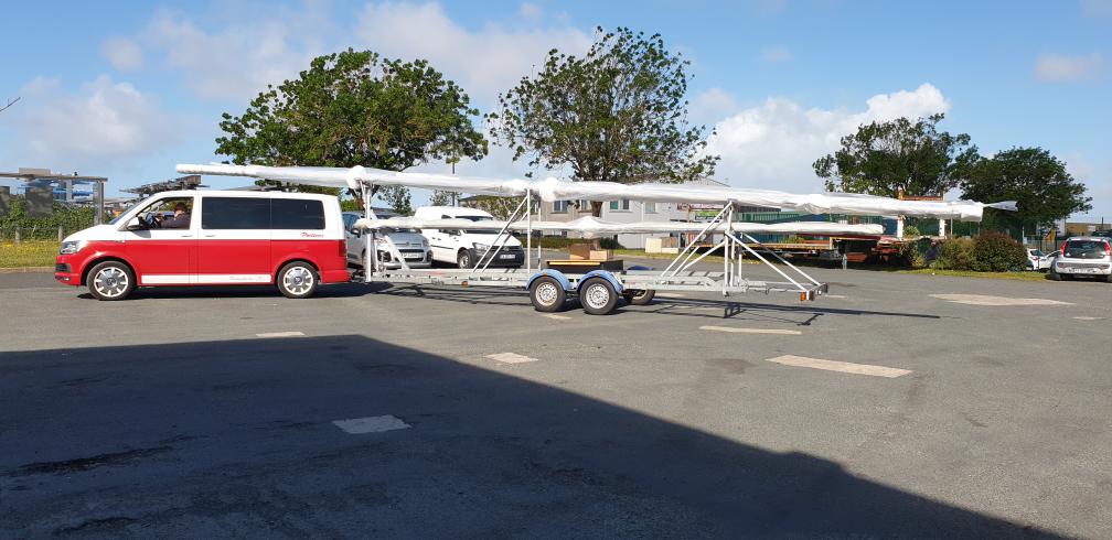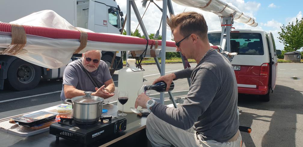 Mit Ronnys Bulli geht es 2.000 Kilometer nach La Rochelle, Frankreich. Dort laden wir den Mast auf und verzurren ihn sicher für die 2.000km lange Fahrt zurück nach Deutschland.