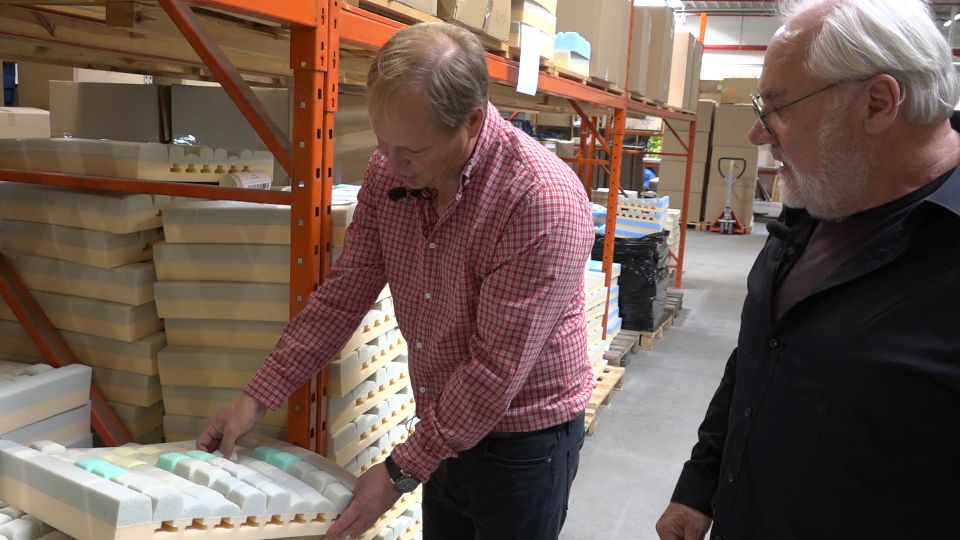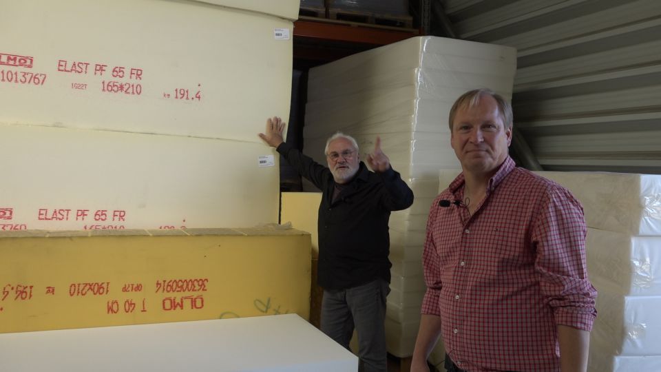 Damit die Matratzen allen Anforderungen auf See standhalten, werden sie aus mehreren Schichten unterschiedlicher Materialien hergestellt. Auf den „Kern“ hält Frank gerade seine Hand.