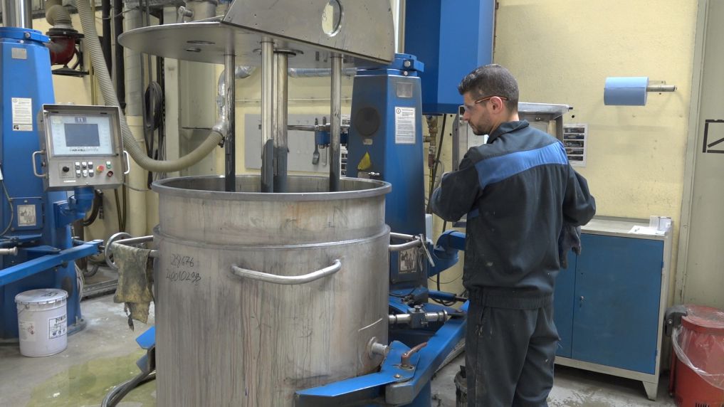 Und all diese Komponenten müssen vermischt werden. Hier ist Damien gerade am Industriemischer und und stellt 300 Kilogramm graue Antikorrosionsfarbe her.