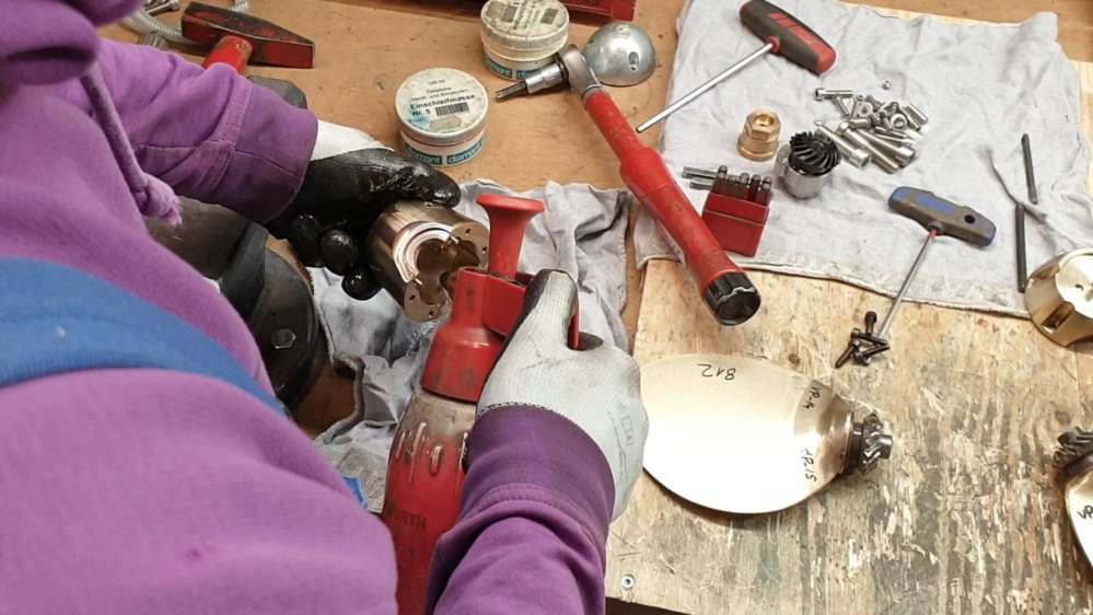 Aus einem Bronzerohling wird das Gehäuse für den VariProp gefräst.