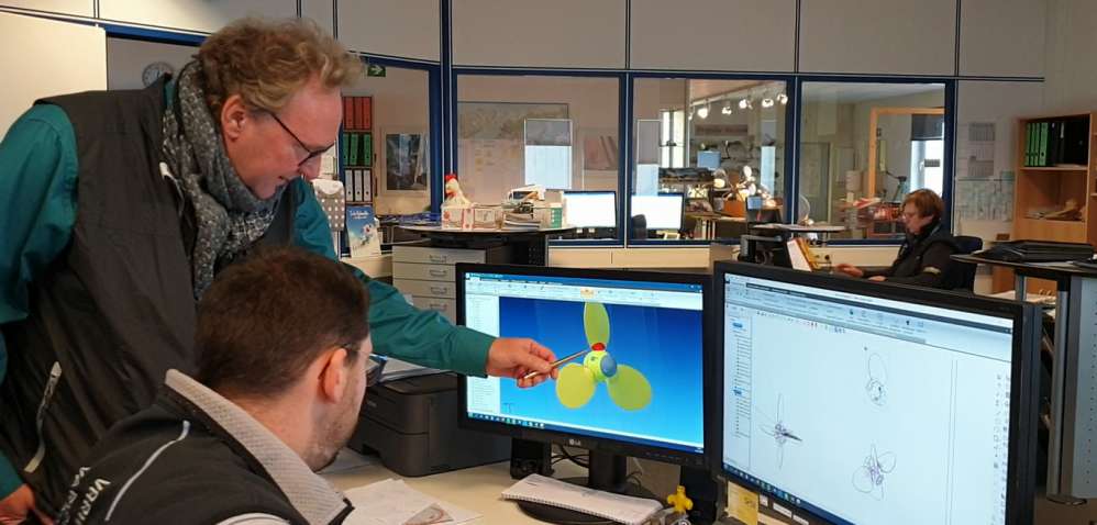 Das 3D-Design bei der Entwicklung von Propellern ist heutzutage nicht mehr wegzudenken: Jörg Adamczyk zeigt Daniel Schweren eine Neuerung am Bildschirm.