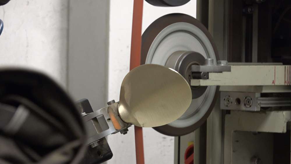 Ein Propellerblatt wird mit dem Roboter geschliffen.