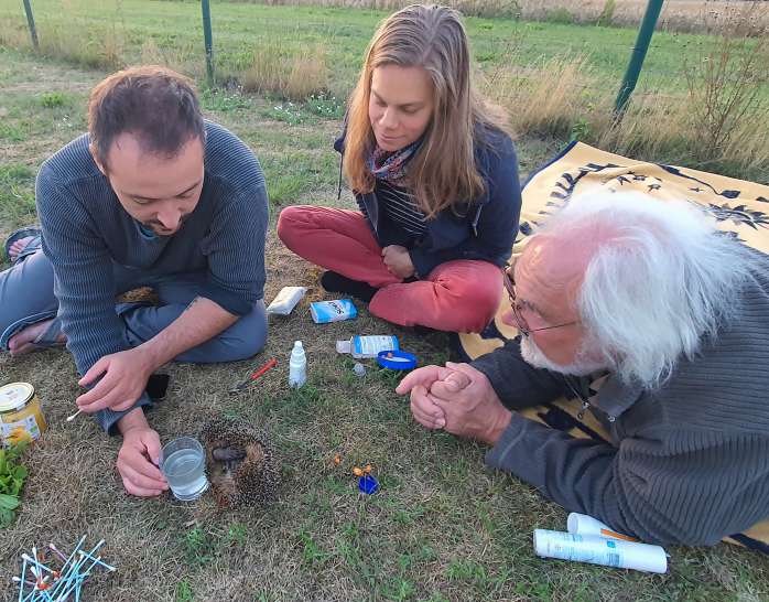 Nicolas (links), Anna und Frank bei der medizinischen Versorgung eines verletzten Igels.