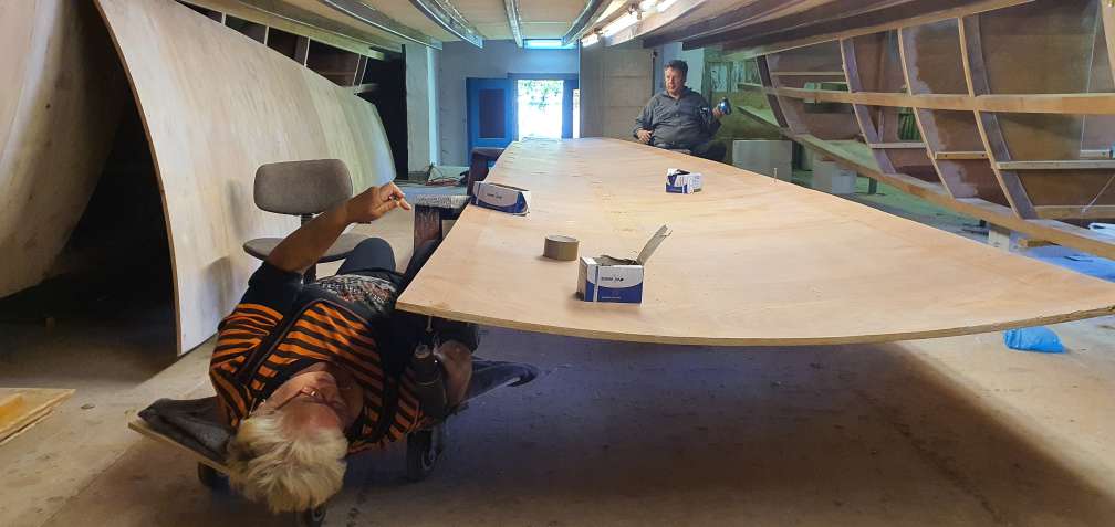 Peter (rechts) bei den Vorbereitungen für die Verklebung der Innenhaut.