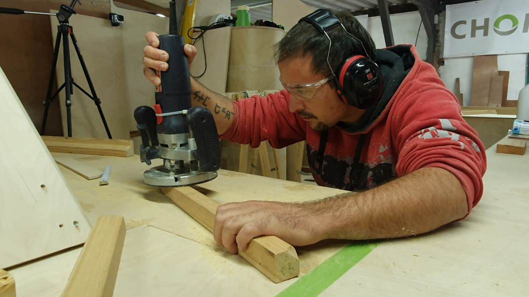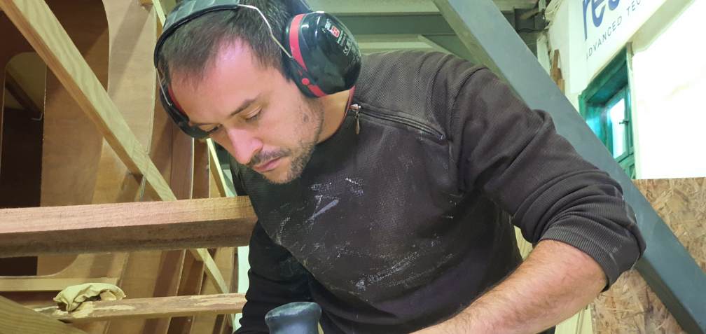 Nicolas beim Fräsen von Lärchenlatten für die Achterkabine.