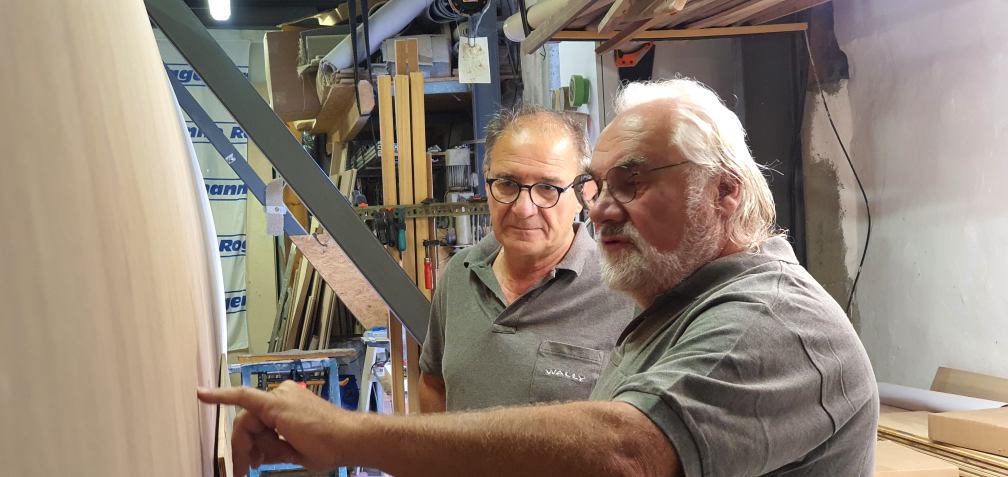 Frank (r., CEO von FYD-Adventure) bespricht mit Maurizio die Kohlefaserversteifung auf der Außenhaut.