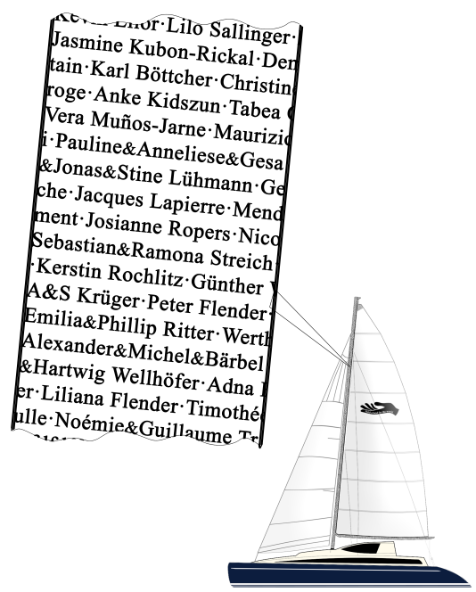 Wer mindestens 100 € spendet, dem bieten wir an, seinen Namen oder den einer anderen gewünschten Person auf dem Mast unserer Expeditionsyacht mit einer Spezialfolie zu verewigen und 10 Jahre um den Erdball zutragen.